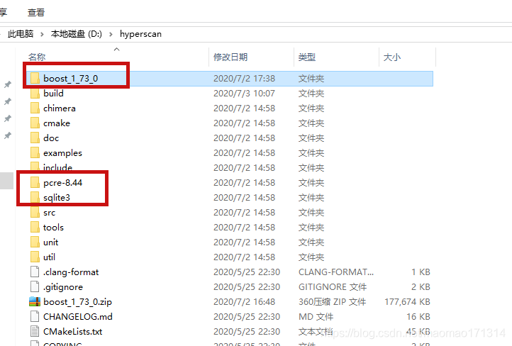 - 将以上源码包解压到hyperscan 文件夹下,并将sqlite-amalgamation 重命名为sqlite3,最终目录结构如下: