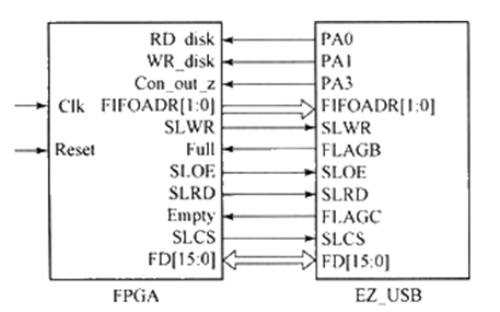 本系统主要是由FPGA和USB2.0控制器CY7C268013组成,系统框图及其信号连接关系如图1所示。可以根据实际系统的需要,用FPGA实现预定功能,如数据采集卡、控制硬盘读写等。