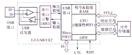 Cypress公司的EZ-USB FX 2是第一个包含USB2.0的集成微控制器,它内部集成了1个增强型的8051、1个智能USB串行接口引擎、1个USB数据收发器、3个8位I/O口、16位地址线、8.5 kB RAM和4 kBFIFO等。增强性8051内核完全与标准8051兼容,而性能可达到标准8051的3倍以上。其框图如图2所示。