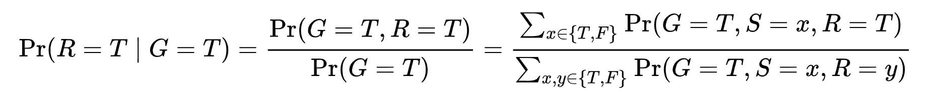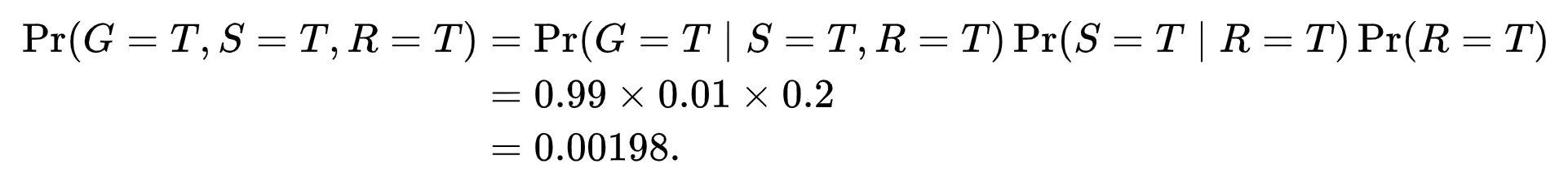 使用联合概率函数的展开Pr(G,S,R)}以及图中所述的条件概率表 (CPT)中的条件概率,可以评估分子和分母中的每个项。