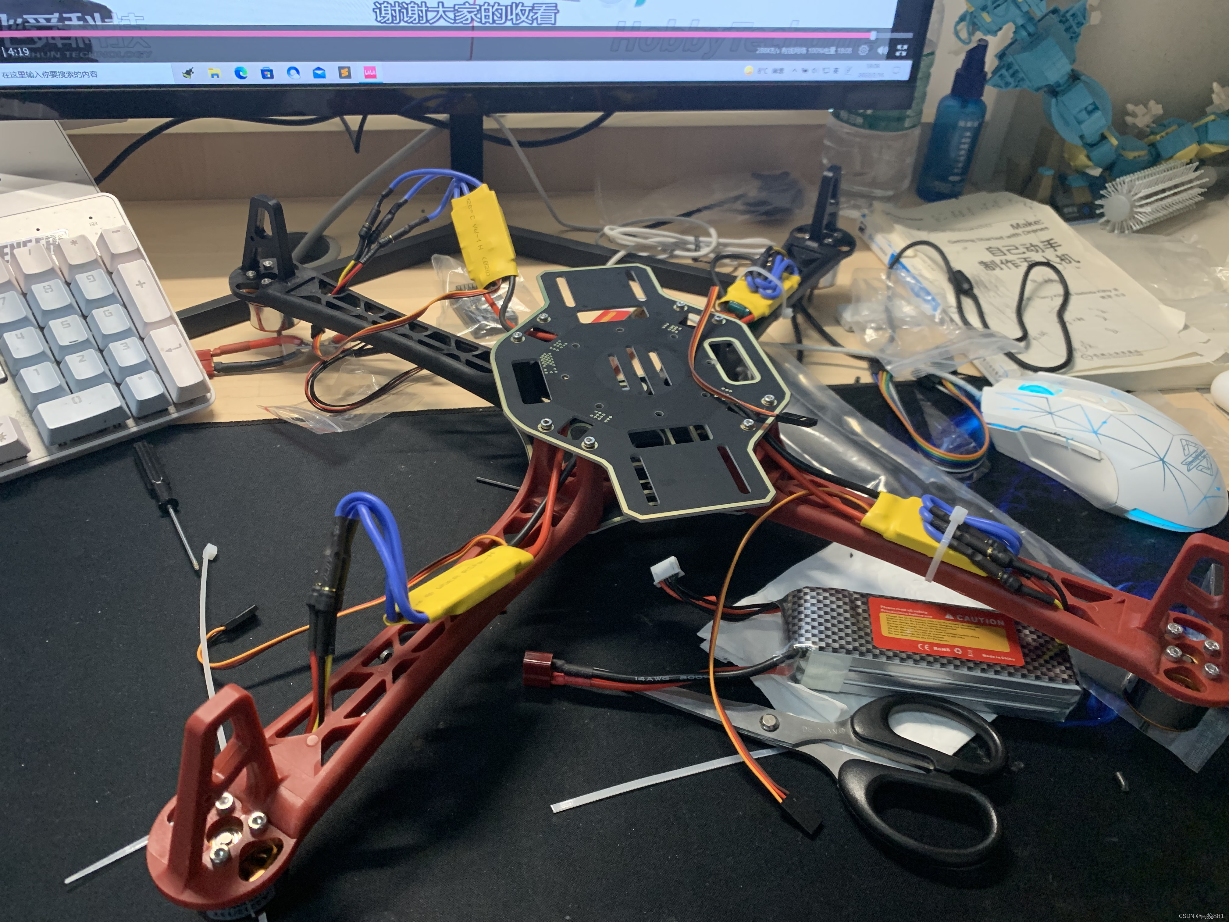 购买好基础零件 我们就可以开始组装了,首先焊接四个电调以及电源排线,再安装好四个机臂,以及四个无刷电机,