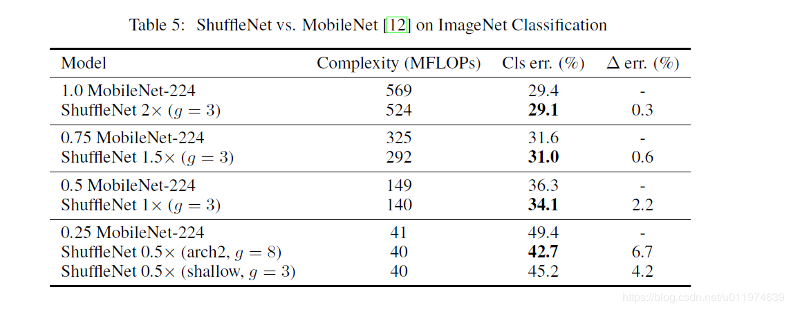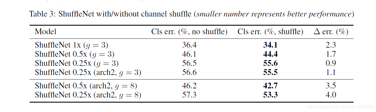 除此之外,作者还对比了不采用channle shuffle和采用之后的网络性能对比,如下表的看到,采用channle shuffle之后,网络性能更好,从而证明channle shuffle的有效性。