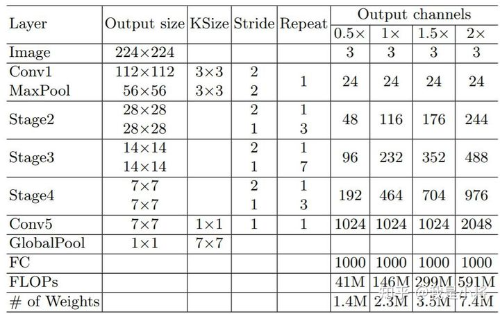 ShuffleNetv2的整体结构如表2所示,基本与v1类似,其中设定每个block的channel数,如0.5x,1x,可以调整模型的复杂度。