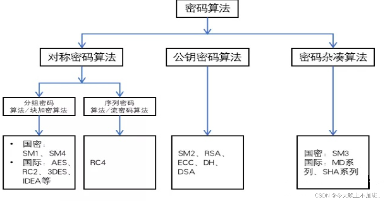 密码算法主要可以分为三大类:对称密码算法、公钥密码算法(非对称密码算法)、密码杂凑算法