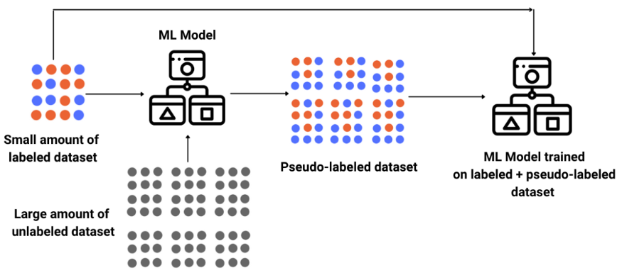 伪标签方法分两步工作。第一步,在有限的标记数据集上训练模型。第二步利用相同的模型在未标记的数据上创建伪标签,并将高置信度的伪标签作为目标添加到现有的标记数据集中,从而创建额外的训练数据。