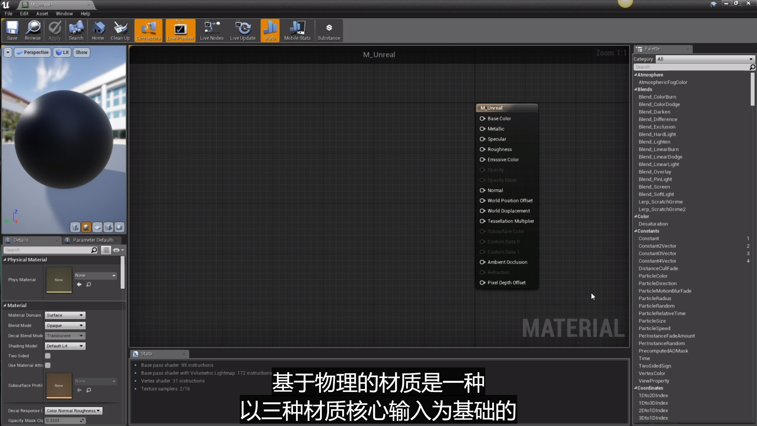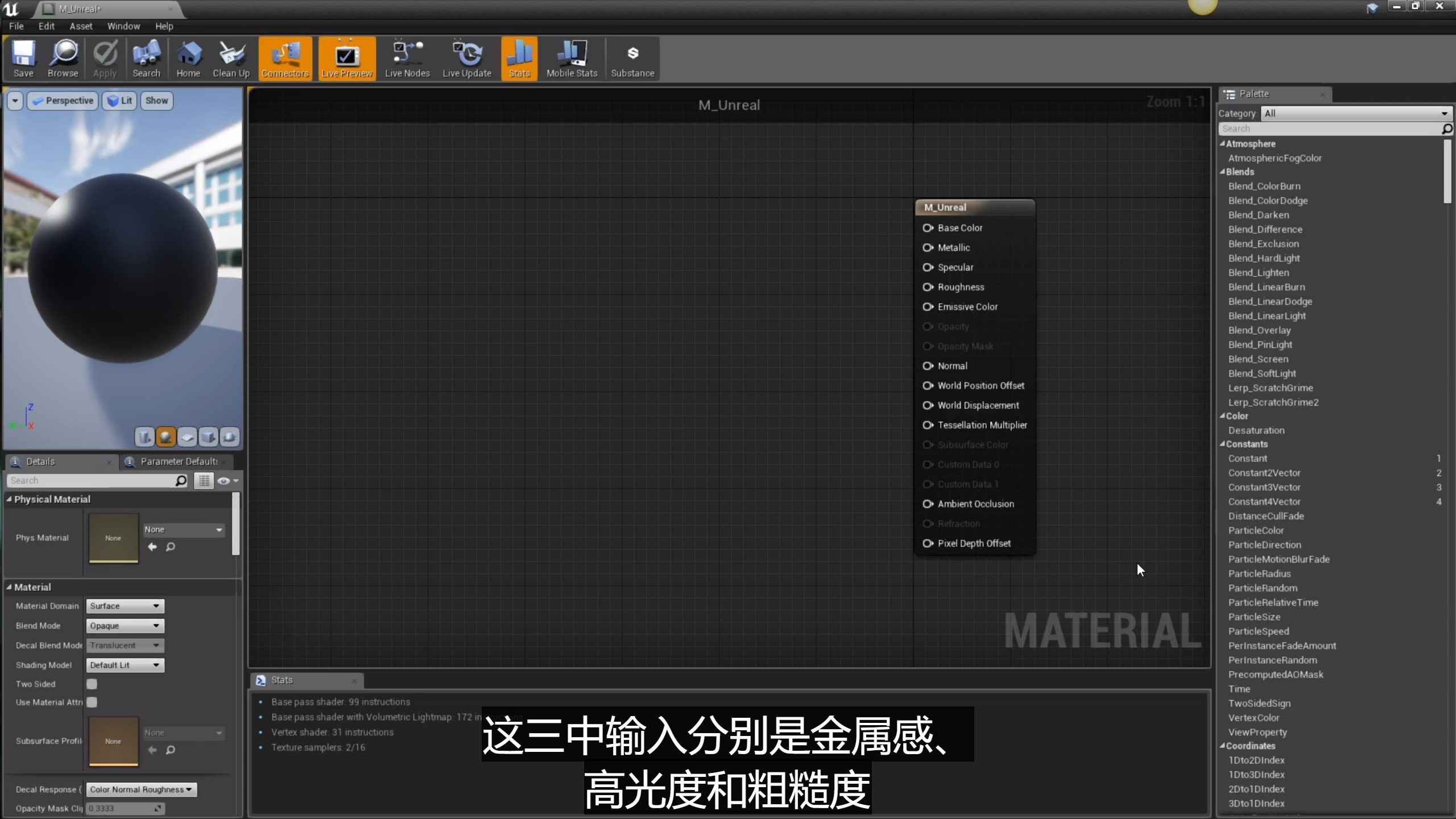 虚幻引擎可以提供非常真实的基于物理的材质和渲染系统,基于物理的材质是一种以三种材质核心输入为基础的实时算法,十分方便美术师使用。这三种输入分别是Mtallic金属感,Specualr高光度,Roughness粗糙度。