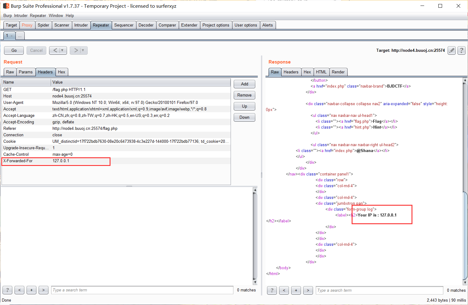 flag页面显示ip,hint页面源代码有提示