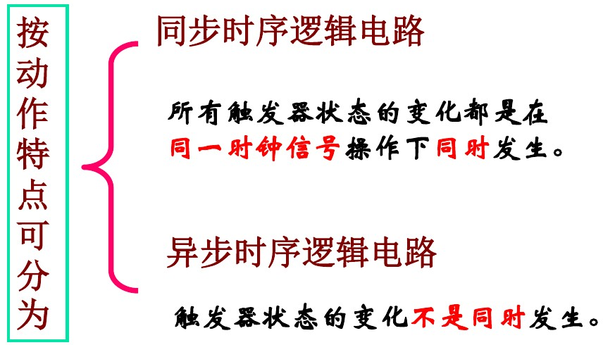 逻辑设计领域主要有两种类型的时序电路,它们分类的标准取决于我们观察到的输入信息的时机和内部状态改变的时机。同步时序电路 (synchronous sequential circuit)的行为可以根据其在离散的时间点上的信号信息来定义。而 [2] 异步时序电路(asynchronous sequential circuit)的行为则取决于任意时刻的输入信号以及输入信号在连续的时间内变化的顺序。