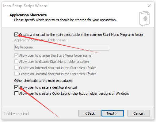 指定应用程序的快捷方式,勾选默认的两项即可,即“创建主执行程序的快捷方式到公共开始菜单程序文件夹”、“允许用户创建桌面快捷方式”