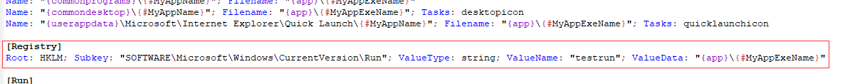 Root: HKLM; Subkey: "SOFTWARE\Microsoft\Windows\CurrentVersion\Run"; ValueType: string; ValueName: "testrun"; ValueData: "{app}\{#MyAppExeName}" 设置完成后,再执行脚本。