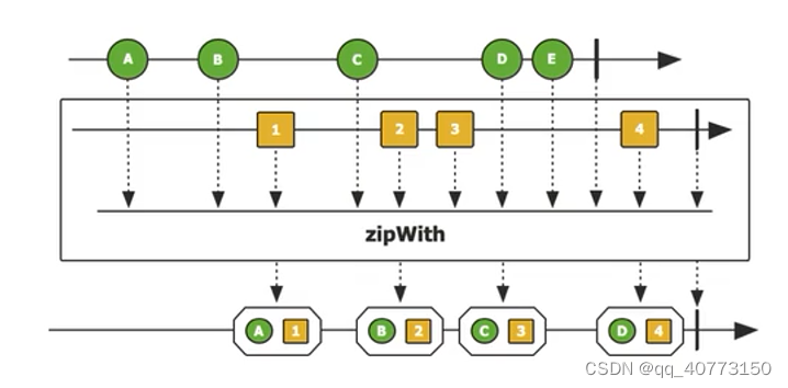 Flux.just("a", "b").zipWith(Flux.just("c", "d","e","f")).subscribe(System.out::println);// 结果:a-c b-d