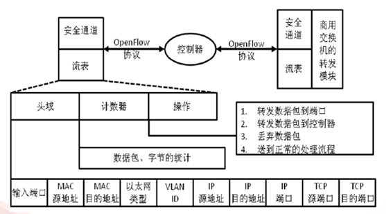 OpenFlow交换机由流表、安全通道和OpenFlow协议三部分组成: