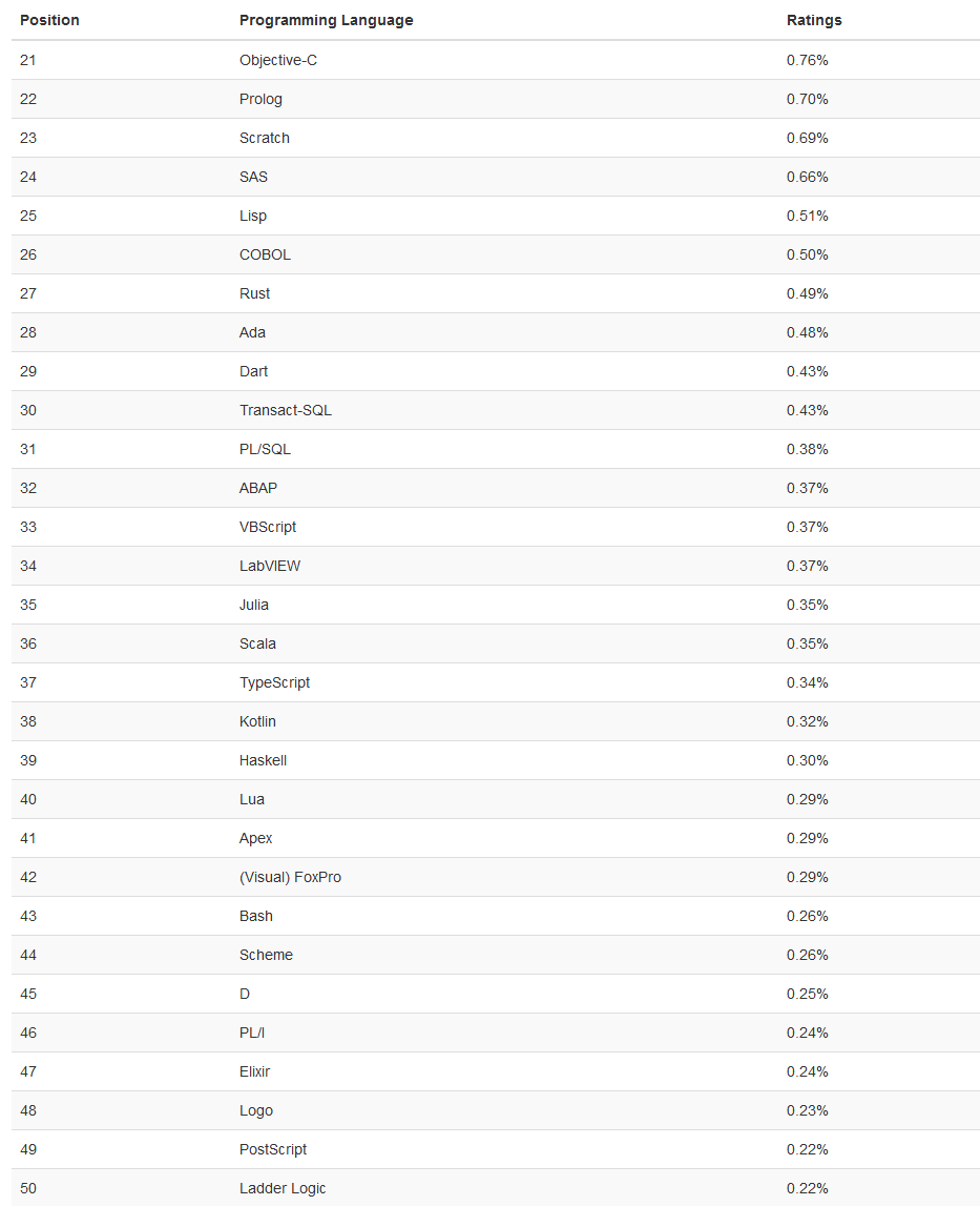 这个排行榜可以用来考察你的编程技能是否与时俱进,也可以在开发新系统时作为一个语言选择依据。