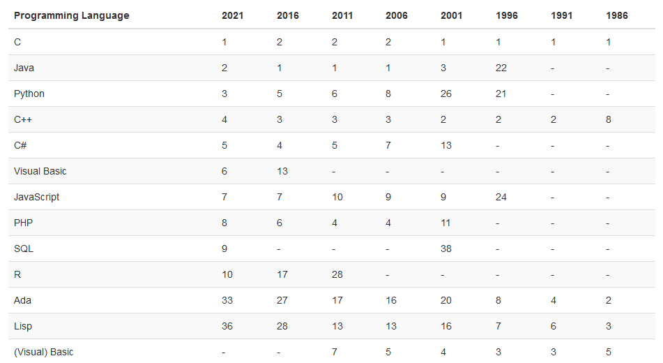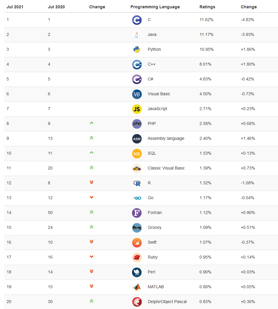 回想 2001 年仅作为个人项目首次发布的 TIOBE 排行版,当时榜单前三甲为 Java、C 和 C++。神奇的是,即便 20 年过去了,这个排位也并没有发生大洗牌——7 月 TIOBE 排行榜前三名为 C、Java 和 Python,C++ 位列第四。