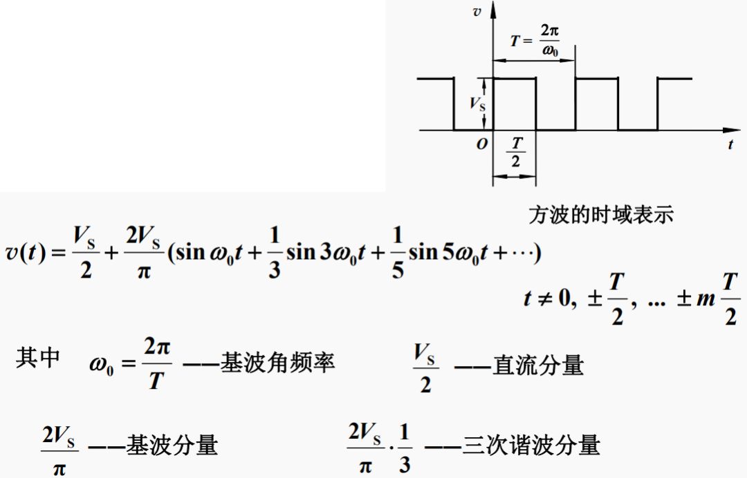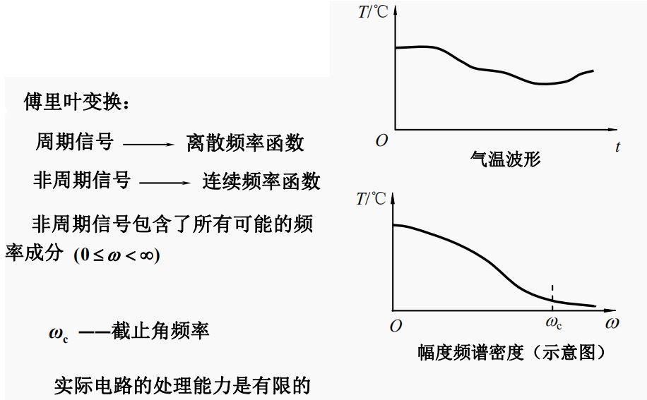 ● 同一个信号既可以在时域中描述,也可以在频域中描述。理论上许多非正弦信号的频谱范围都会延伸到无穷大,而电路的处理能力却是有限的。通常将信号在某一频率点处截断,仅处理保留下来的有限频率范围内的信号。当丢弃高于该频率的部分信号基本不影响信号特性时,保留下来的频率范围称为这种信号的带宽。信号的频谱特性是设计电子电路频率响应指标的主要依据。
