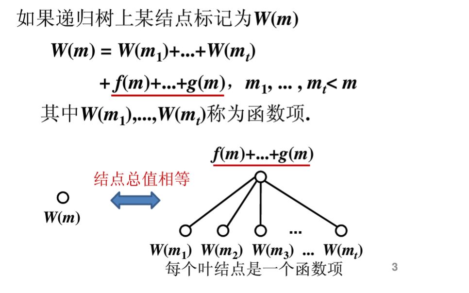 假定上面的是递归方程,左边是规模为 m 的工作量 W(m) 。右边出现它的一些子问题(带W()的项,我们称为函数项),划分规划需要的工作量(称为非函数项)。