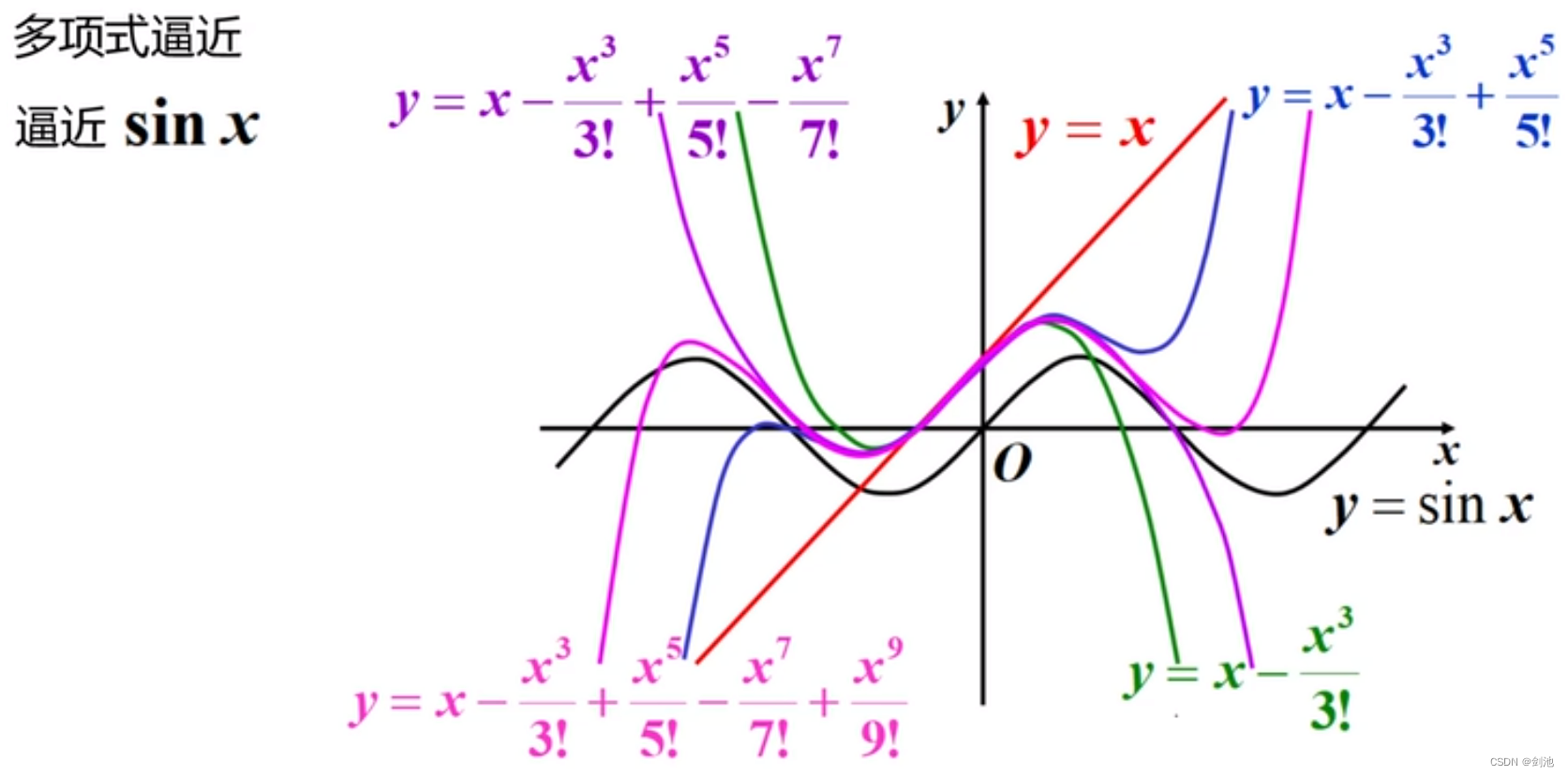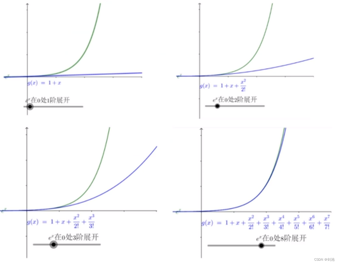 多项式逼近。对于函数 ,在 x = 0 处进行一阶展开,二阶展开,多阶展开