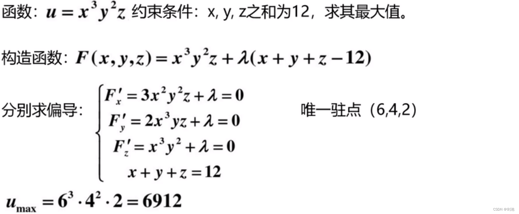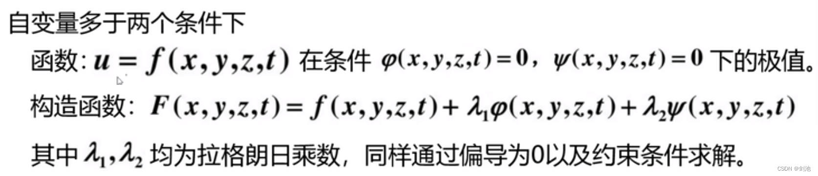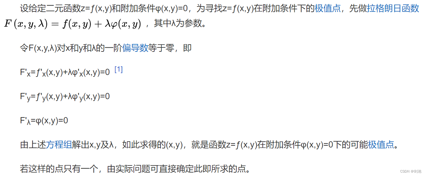 是求函数 f(x1,x2,...) 在 g(x1,x2,...)=0 的约束条件下的极值的方法。其主要思想是引入一个新的参数 λ (即拉格朗日乘子),将约束条件函数与原函数联系到一起,使能配成与变量数量相等的等式方程,从而求出得到原函数极值的各个变量的解。