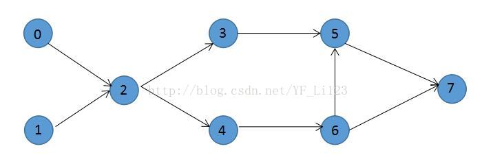 因此,对于下图的一个拓扑序列可以是:0,1,2,3,4,6,5,7 也可以是:0,1,2,4,6,3,5,7