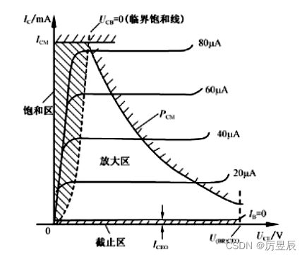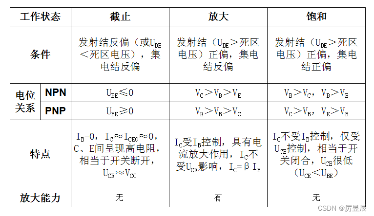 【注意】:三极管作放大器件使用时,工作在放大区;作开关器件使用时,工作在截止区和饱和区。
