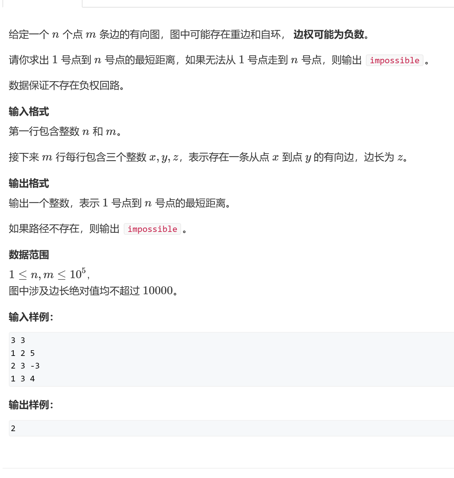 {memset(h,0xff,sizeof(h));memset(dist,0x3f,sizeof(dist));dist[1]=0;queue[0]=1;st[1]=1;scanf("%d %d",&n,&m);int a,b,c;while(m--){scanf("%d %d %d",&a,&b,&c);add(a,b,c);}while(hh<=tt){int num=queue[hh];hh++;st[num]=0;for (int i=h[num];i!=-1;i=ne[i]){int k=e[i];if (dist[k]>dist[num]+w[i]){dist[k]=dist[num]+w[i];if (st[k]==0){st[k]=1;queue[++tt]=k;}}}}if (dist[n]==0x3f3f3f3f){printf("impossible\n");}else{printf("%d\n",dist[n]);}return 0;