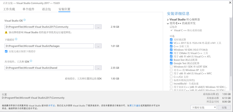 5. 更改安装路径,默认是C:\Program Files (x86)\Microsoft Visual Studio\2017\Community,这里选择将Visual Studio IDE安装到D:\ProgramFiles\Microsoft Visual Studio\2017\Community,将下载缓存安装到D:\ProgramFiles\Microsoft Visual Studio\Packages,将共享组件、工具和SDK安装到D:\ProgramFiles\Microsoft Visual Studio\Shared,如下图所示: