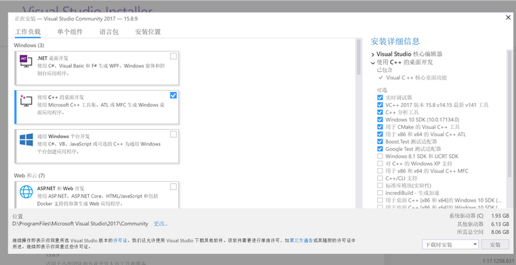 6. 工作负载这里仅勾选”使用C++的桌面开发”,单个组件和语音包使用默认,如下图所示:
