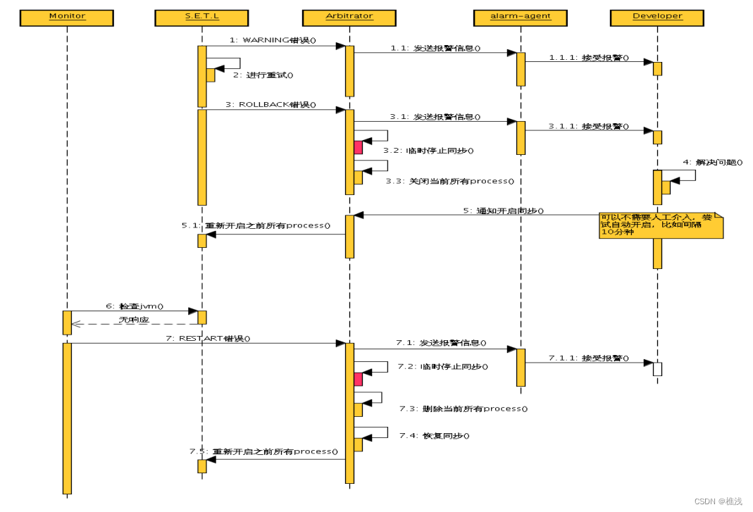 - RESTART:前面几个步骤和ROLLBACK基本类似,唯一不同点在于,在释放锁之前会尝试修改分布式Permit为true,重新开启同步,然后释放锁。