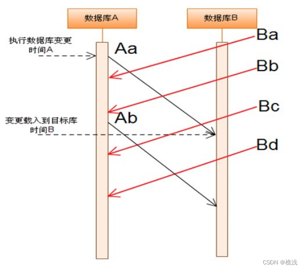 3. 图中纵轴为时间轴,Aa代表从数据库A同步到数据库B的一个同步过程,Ba代表从数据库B到同步到的数据库A的一个同步过程,每个同步过程在纵轴上会有两个点,分别代表变更时间A和同步时间B。