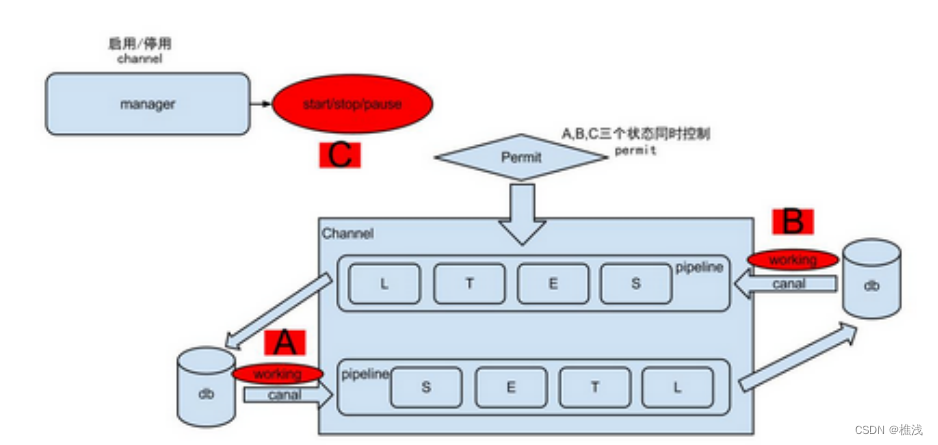 注意:A,B,C三点状态都正常才允许进行同步(解决数据单向覆盖)。 任何一边的canal不正常工作,都应该停掉整个双向同步,及时性越高越好。