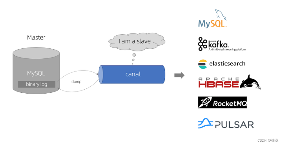 canal的工作原理就是把自己伪装成MySQL slave,模拟MySQL slave的交互协议向MySQL Mater发送 dump协议,MySQL mater收到canal发送过来的dump请求,开始推送binary log给canal,然后canal解析binary log,再发送到存储目的地,比如MySQL,Kafka,ElasticSearch等等。