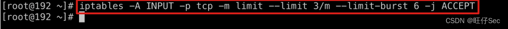 5. 为防御拒绝服务攻击,设置iptables防火墙策略对传入的流量进行过滤,限制每分钟允许三个包传入,并将瞬间流量设置为一次最多处理6个数据包,(超过上限的网络数据包将丢弃不予处理)。