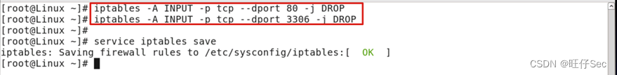 3.为防止Nmap扫描软件探测到关键信息,设置iptables防火墙策略对80、3306号端口进行流量处理;