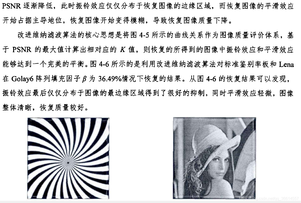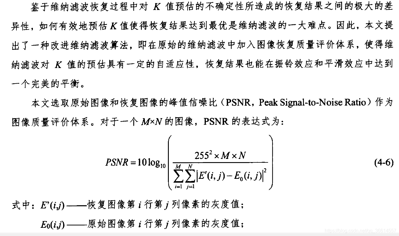 前情提要:维纳滤波函数中不同K(噪声与原属图像功率谱之比)的取值对应复原效果不同,当K值比较小时(10^-4~10^-3)时,图像边缘存在着严重的振铃效应,而随着K的慢慢增大,振铃效应越来越弱直至消失,最后图像变得越来越模糊。所以作者提出了一中基于PSNR的图像质量评价体系的改进的维纳滤波算法,目的是选取最优的K值,使得用该K做维纳滤波得到的复原后的图像与原始图像最为接近(PSNR值最大)。