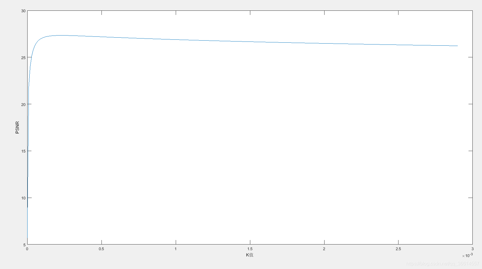 但原文似乎没有对此方法的详细介绍,所以姑且用一个简单的方法考虑:每次K按一定方式,从10^-5~到10^3量级增加,判断以当前K值进行维纳滤波得到的复原图像与原始图像的差异度(即PSNR)是否比历史最优值更好,类似于遍历找最大值的策略,但量级跳度过大,如果按照 10^-5~到10^3量级的原则来的话,需要进行10^8次计算,这无疑增加了计算量。根据观察,可以根据原文中K值与PSNR值曲线来进行K的跳度限制:最开始随着K值的增加,PSNR迅速增大到最大值后开始越来越平稳地减小,相对应可设置最开始阶段K值的增加(步长)为10^-5级,之后根据K值来对步长进行扩增,如10倍等。当然精度可以根据需求或者个人喜好等随意修改,在代码中,初始化K为0,步长step为1*10^-5(matlab中可以简单表示为1e-5),当K值增加到是步长的100倍时,步长相应地增加到原来的10倍,直至K大于1000,停止循环。