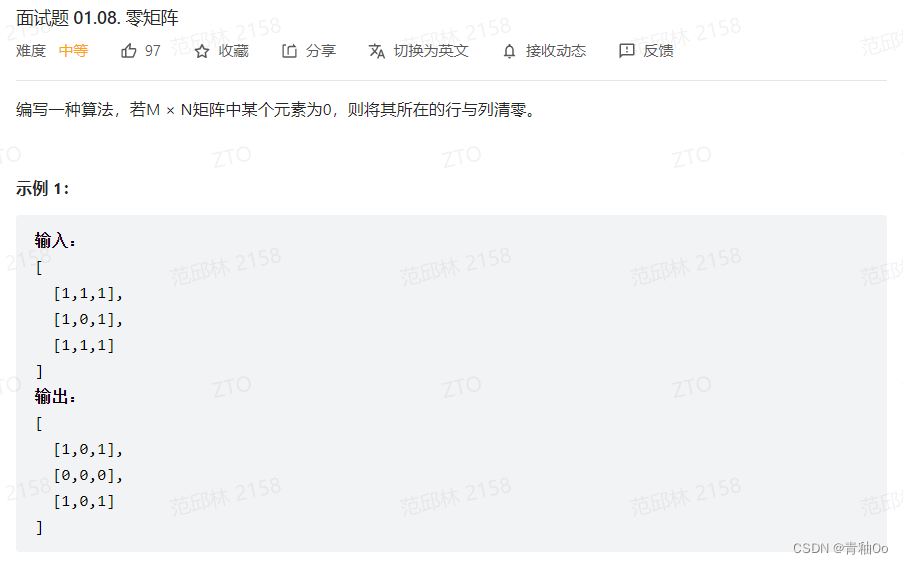 class Solution {public void setZeroes(int[][] matrix) {int m = matrix.length;int n = matrix[0].length;boolean[] row = new boolean[m];boolean[] col = new boolean[n];for(int i = 0; i < m; i++) {for(int j = 0; j < n; j++) {if(matrix[i][j] == 0) {row[i] = col[j] = true;}}}for(int i = 0; i < m; i++) {for(int j = 0; j < n; j++) {if(row[i] || col[j]) {matrix[i][j] = 0;}}}}