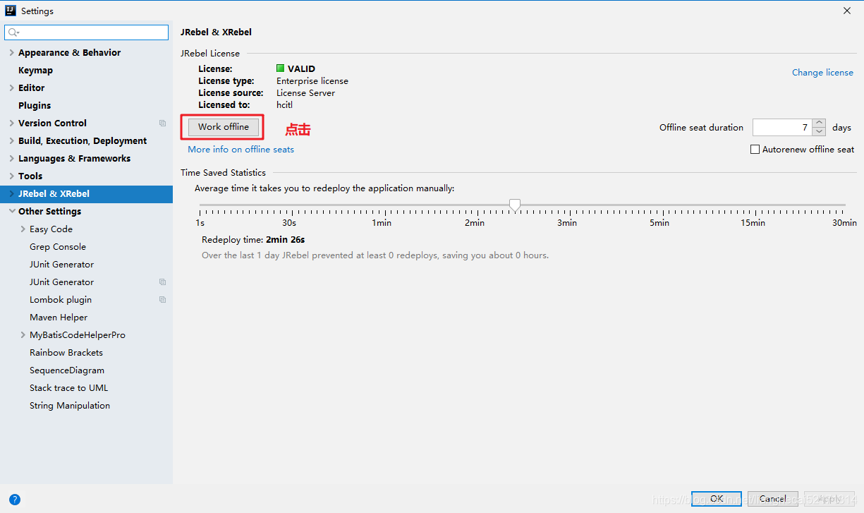 第三步:打开jrebel 如下所示面板,选择Connect to online licensing service