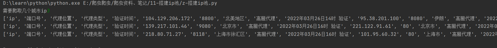 city_num = int(input("需要爬取几个城市ip")) # 1~34之间,该网站只有34个城市页面content_list = []for i in range(city_num): # 批量爬取list_ip关键信息并保存response = get_list_ip(i)list = dispose_list_ip(response)content_list += list # 将每一页获取的列表连接起来print(content_list)
