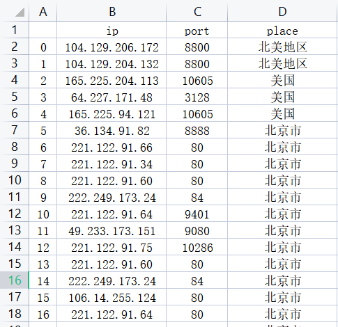 def save_list_ip(content_list,file_path):columns_name=["ip","port","place"]test=pd.DataFrame(columns=columns_name,data=content_list) # 去掉索引值,否则会重复test.to_csv(file_path,mode='a',encoding='utf-8')print("保存成功")