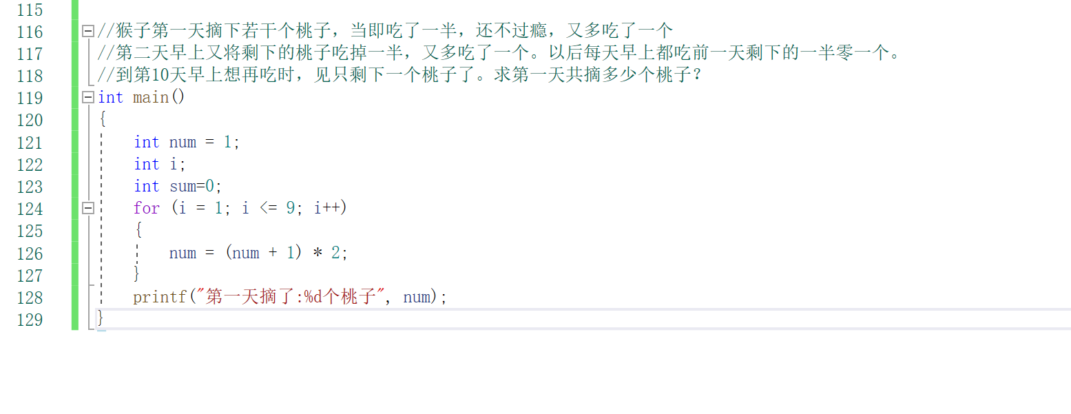 {int num = 1;int i;int sum=0;for (i = 1; i <= 9; i++){num = (num + 1) * 2;}printf("第一天摘了:%d个桃子", num);return 0;