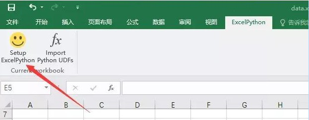 2.回到Excel,点击 ExcelPython标签的 SetupExcelPython按钮
