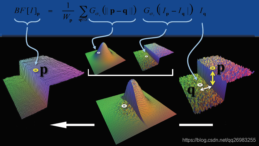 双边滤波器也是一种保边滤波器.和导向图滤波器一样,可以达到在平坦区域进行均值(高斯)滤波的效果,在边缘不进行滤波的效果.其原理为一个与空间距离相关的高斯函数与一个灰度距离相关的高斯函数相乘.
