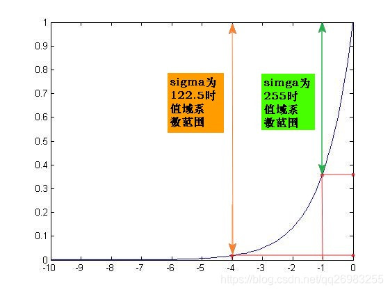 1)假设sigma = 255,当△g = 255时,系数为exp(-1) = 0.3679,当△g = 0时,系数为exp(-0)= 1.灰度最大点的系数与相差最小的灰度值系数之比为 0.3679.