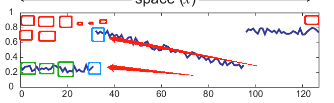 如何定义边缘的大小阈值呢,那就是卷积核的大小,如果卷积核过大,上下两个卷积核有了重叠,则表示第32个值和第33个值被同一卷积核覆盖.如果该卷积核是均值滤波影响是相当大的,如果是高斯滤波,那么也同样获取了所谓的'空间'距离(由值域转换,相邻两个值差距越大,在升维度后距离也就越远),这样分配的权重不一样,更加侧重中心.总之,维度变成二维后,二维卷积核就可以直接是普通的高斯滤波(但就剩下空间距离,所谓的值域也变成了空间上的距离,即图中的上下两个蓝框).