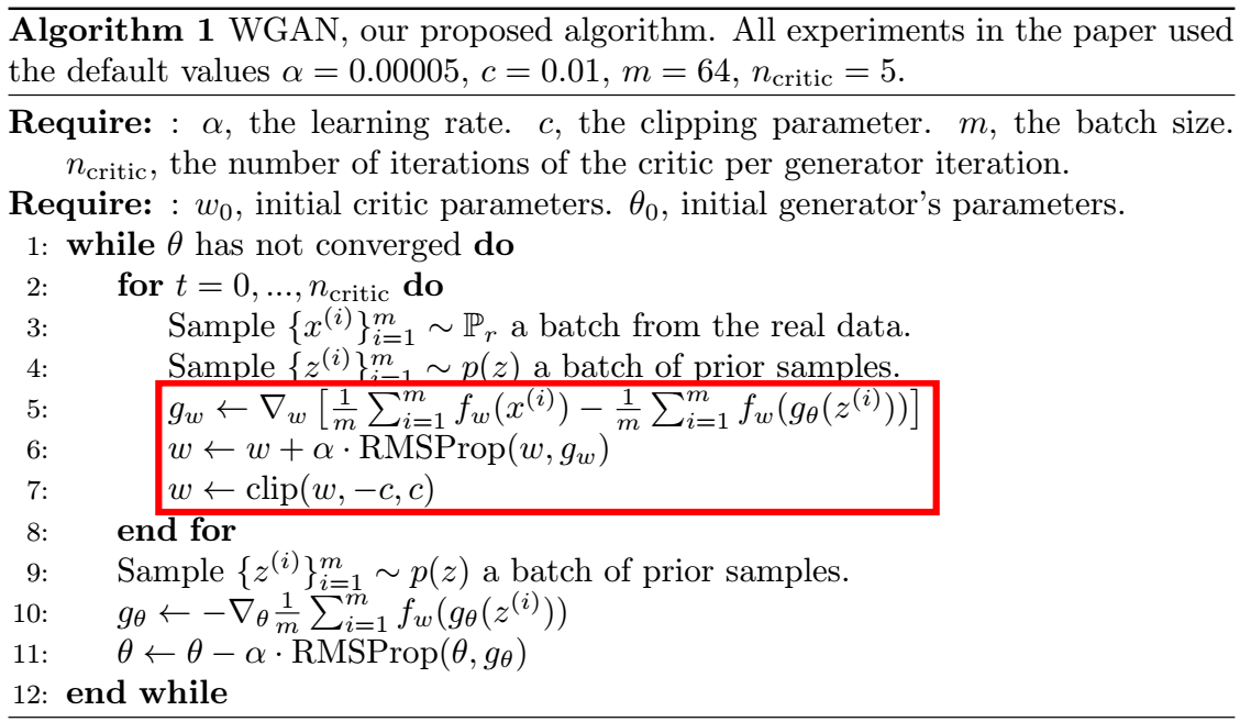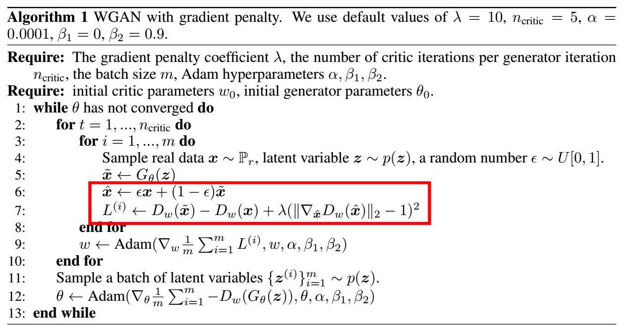 WGAN -GP的算法如下,与WGAN对比一下,就可以看出区别了: