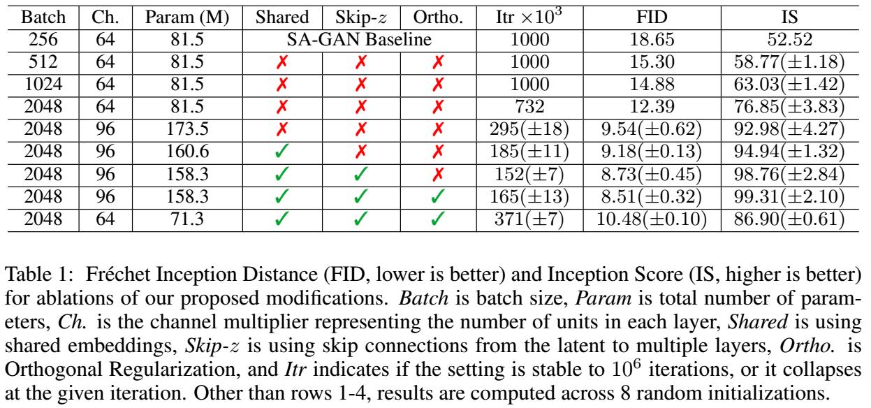 第三节,作者探索了大尺寸GAN训练的方法,获取大模型和大batch带来的性能提升。baseline使用SAGAN,给G的输入附加分类信息,使用的hinge loss函数,优化器设置是G、D学习率一致,每优化两次D优化一次G。详细信息在论文的附件C 。采用两个评价指标:Inception Score (IS),越大越好;Frechet Inception Distance (FID),越小越好。