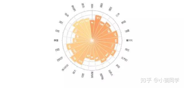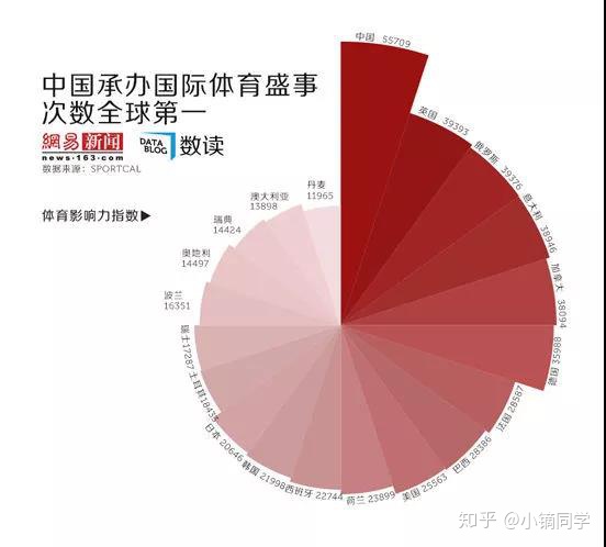 下图是最基本的玫瑰图,显示了不同国家和其体育影响力指数,除了扇形的面积,扇形的颜色也可以表示数据的大小。由图可知,中国是国际体育盛事的中心,影响力最大。英国以接近4万的分数位居第二。