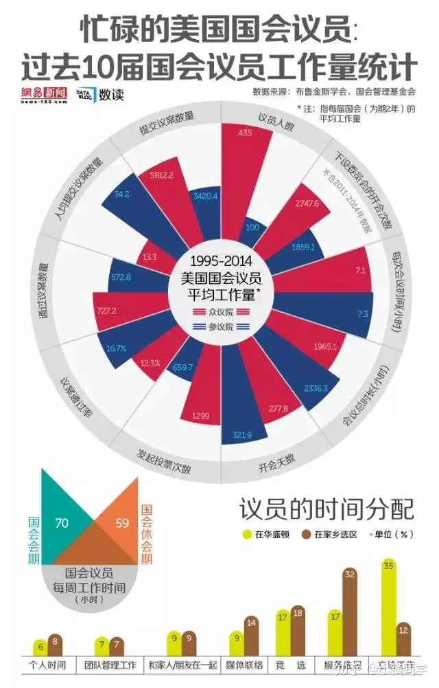 图中蓝色和红色分别表示众议院和参议院。尽管成为国会议员对于很多有志从政的人来说是梦想, 然而国会议员的工作异常忙碌。由图可知,过去的10届国会(1995-2014,每届2年)参众两院分别平均每年有160天和140天在开会。