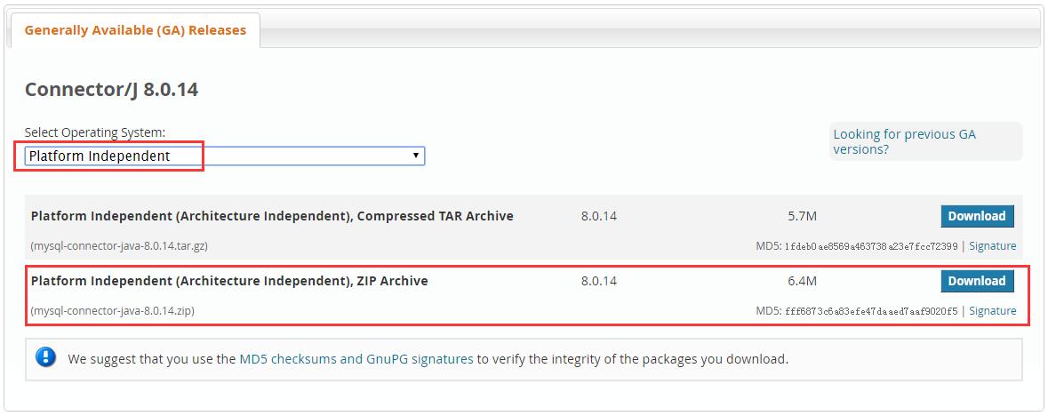 进入下载地址:https://dev.mysql.com/downloads/connector/j/