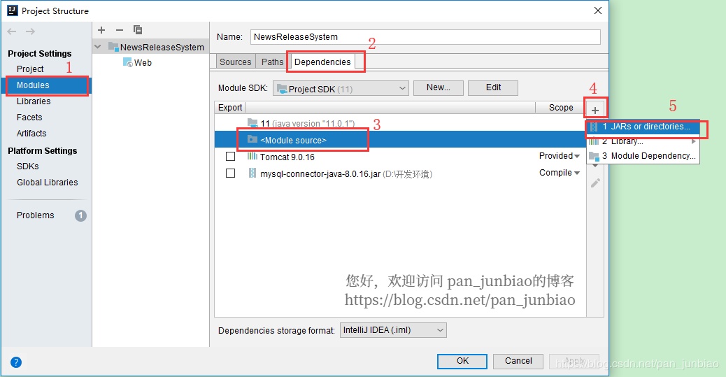 (2)打开Project Stucture项目结构窗体后,选择:Modules → Dependencies → <Module source> → 点击右边的“+”加符号 → JARs or directories(如下图)。